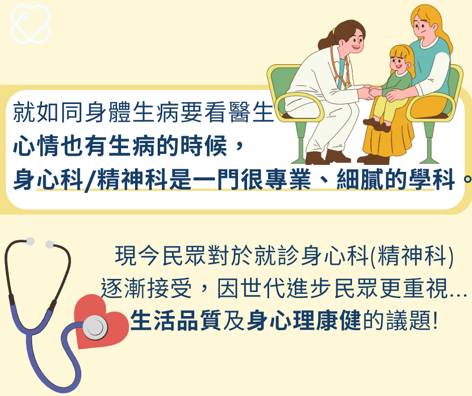 精神科/身心科是一門很專業、細膩的學科,其涵蓋各年齡範疇,從小朋友常見的注意力不集中(過動症)、拒學~青少年情緒困擾、成年人各式壓力困擾、失眠困擾/睡眠障礙、老年人身心調適、失智症…等;如果有相關困擾,請盡早求醫,讓生活恢復軌道。