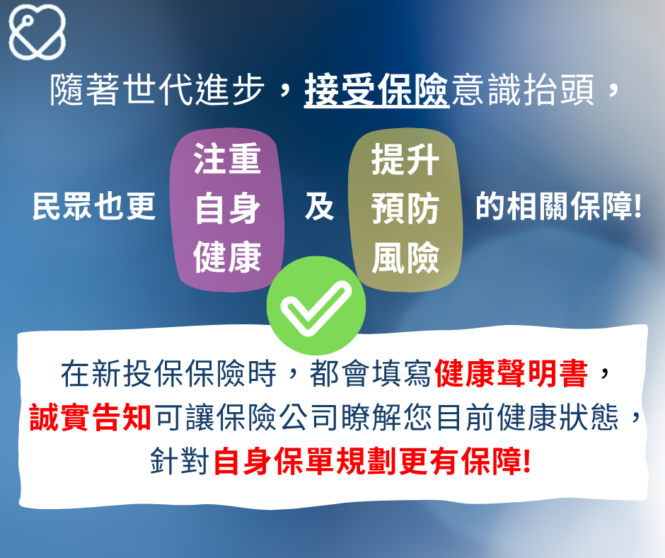 ☀在投保新險種時,都會填寫健康聲明書,誠實告知可讓保險公司瞭解您目前健康狀態,